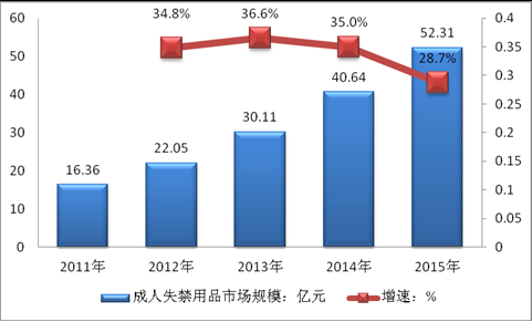 2011年我國成人失禁用品市場規模為16.36億元,2015年增長至52.31億元。