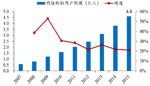 2007-2015年中國網絡購物用戶規模及增速