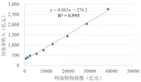 快遞業收入規模和網絡購物市場交易規模呈現明顯的線性正相關關系。根據2007-2015年快遞業收入規模與網購市場規模數據進行回歸分析,我們發現二者存在高度正相關,快遞業收入規模(Y)與網絡購物市場規模(X)關系為y=0.063x+270.2,R2為0.995,即網絡購物市場每增加100億元規模將給快遞業市場帶來6.3億元的收入。