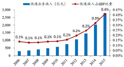 2006-2015年中國快遞業收入與占GDP比重