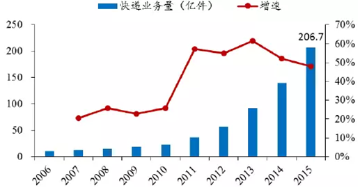 2006-2015年中國快遞業務量及增速