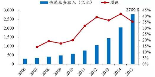 2006-2015年中國快遞業務收入及增速