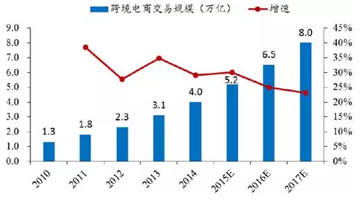 4)2015年,我國跨境電商交易規模達4.0萬億元,增長率為29.0%,預計2017年將達到8.0萬億元。2010年-2015年,我國跨境電商交易量年均增速超過35%,而同期我國進出口貿易總額年均增速約為9%,跨境電商將成為我國外貿的新增長點。一方面,我國正處在消費結構升級的關鍵階段,解決了深層問題以后,高端型和享受型消費方興未艾,從近年跨境電商進口業務快速增長中可見一斑。