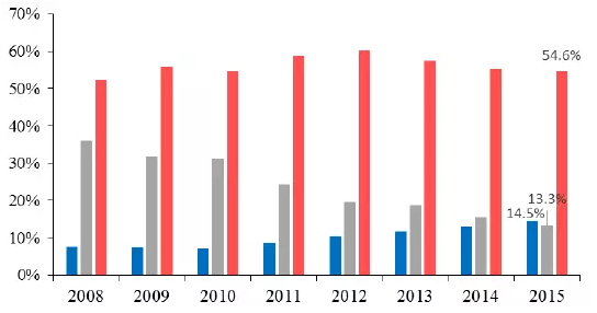 2008-2015年中國快遞業務收入分類型占比