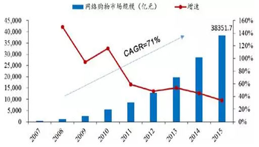 2007-2015我國網絡購物市場規模保持高速增長