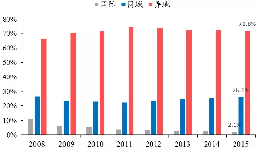 國內快遞以異地快遞業務為主。據國家郵政局統計,2015年,同城、異地和國際快遞業務收入分別占全部快遞收入的14.5%、54.6%和13.3%;業務量分別占全部快遞業務量的26.1%、71.8%和2.1%。從近年數據來看,快遞業務結構總體比較穩定,以異地業務為主,異地快遞收入占比50%以上,業務量占比70%左右。
