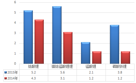 根據(jù)中國有色金屬工業(yè)協(xié)會鋰業(yè)分會對國內(nèi)主要生產(chǎn)企業(yè)的統(tǒng)計。2015 年,我國鋰離子電池正極材料鈷酸鋰產(chǎn)量5.2萬噸,鎳鈷錳酸鋰產(chǎn)量5.6 萬噸,錳酸鋰產(chǎn)量2.1 萬噸,磷酸鐵鋰產(chǎn)量3.8 萬噸,除鈷酸鋰外,其他正極材料產(chǎn)量均大幅增加。