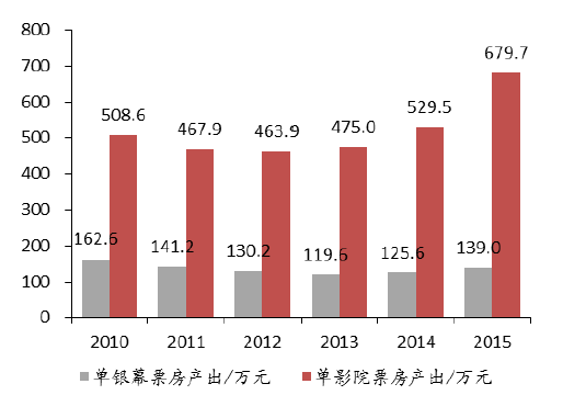 排名2015年2016上半年院線票房(億元)全國票房占比院線票房(億元)全國票房占比1萬達59.813.60%萬達3313.40%2中影星美37.48.50%廣東大地208.13%3廣東大地357.90%中影星美18.67.56%4上海聯和30.77.00%上海聯合17.87.24%5中影南方新干線29.76.70%中影南方新干線17.16.95%6廣州金逸珠江28.96.60%中影數字15.46.25%7中影數字21.14.80%廣州金逸珠江15.26.17%8浙江橫店19.84.50%浙江橫店11.44.63%9浙江時代15.63.50%浙江時代83.27%10江蘇幸福藍海13.63.10%華夏聯合7.83.16%前三合計132.230.00%-71.629.10%前五合計192.643.70%-106.543.30%前十合計291.666.20%-164.366.80%院線資源較為集中,單影院及單銀幕收入2013年迎來向上拐點。2015年中國電影市場票房達到440億,同比增長48.7%,觀影人次達14億人次。過去幾年在電影市場票房高速增長下,院線行業同周期向上,院線、影院和銀幕數量也迎來快速增長,截至2015年我國影院數量達到6,484家,2012-15年復合增速為21%;銀幕數量2015年達32,487塊,2012-15年復合增速為35%。分析2015年度排名前十的院線,可以看出影院總數合計達3302家,占全國總量51%,銀幕數合計達到18420塊,占全國總量57%。從影院使用效率上看,單銀幕及單影院票房收入2013年迎來拐點,2014/2015年不斷提升,2015年單銀幕票房產出為139萬元。