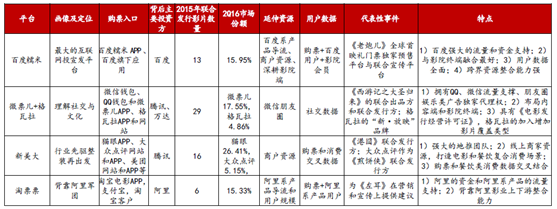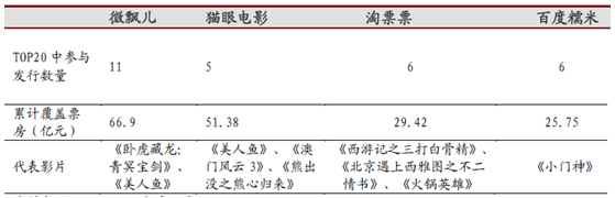 在線票務平臺直接觸及用戶,積累了大量用戶行為數據,其可以利用這些用戶大數據參與電影的宣發。在2016年上半年國內電影票房收入TOP20電影中,僅4部影片沒有在線票務平臺參與發行,7部影片單一平臺獨家發行,9部影片多平臺聯合發行。2015年互聯網購票平臺參與了超過50部的影片發行,在國產電影票房前10的影片中在線票務平臺參與發行其中9部。