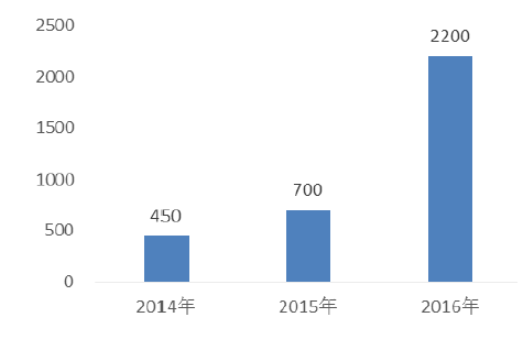 網絡大電影市場從2013年的隱約雛形,到2014年的初具規模,再到2015年的爆發,隨著網絡大電影產量加大的同時單片的投入也在普遍提升,整個網絡大電影市場迅速膨脹。2014年網絡大電影數量達到450部,2015年數量增長到700部,愛奇藝預計2016年數量將爆發式增長到2200部,而隨著單片投入的普遍提升,網絡大電影的制作市場規模迅速膨脹。