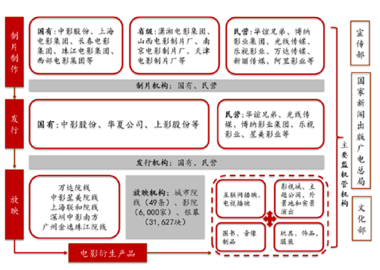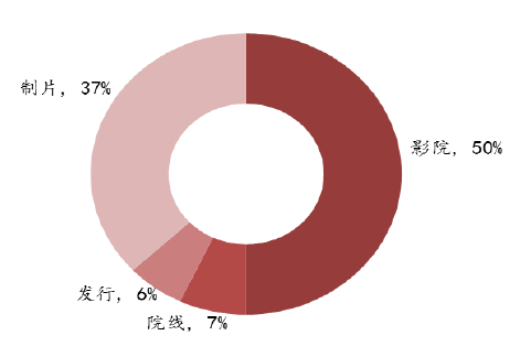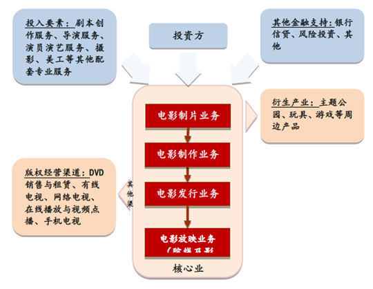 按照現行的票房分賬制度,在扣除國家電影事業發展專項資金(為影院票房收入的5%)及與院線約定的適用流轉稅(營業稅為影院票房收入的3%,營改增后稅率增加至6%)和附加后(城建稅及教育費附加等根據影院所在地規定繳納),院線和影院一般可占57%的比例,確保了較好的現金流水平。我國的電影產業鏈自上而下包括制片、制作、發行、放映、衍生等環節,院線在產業鏈中占據重要一環,目前一些院線公司還向制作、發行等上游環節滲透。