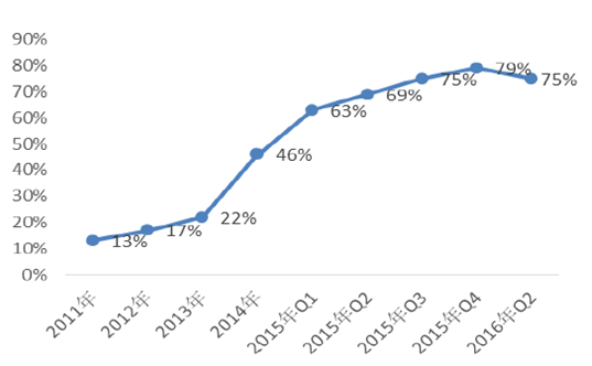 中國內地在線票務市場占有率持續走高,2016年二季度市占率達75%,已經成為我國主流的購票方式。隨著BAT的加入,新美大的合并、微票兒和格瓦拉的聯姻等行業內動作頻發,迎來寡頭競爭時代。