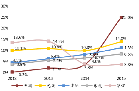 相較美國成熟市場,中國院線行業集中度有進一步提升空間。2015年美國前四大影院的票房收入市場集中度為61%,中國為37%;2014年歐洲前二大院線(Odeon和Cineworld)的市場集中度約50%,同期中國前二大院線集中度僅22.6%,中國目前的院線集中度仍有進一步提升空間。
