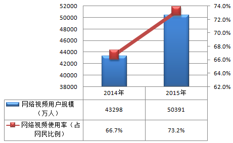 截至2015年12月,中國網絡視頻用戶規模達5.04億,較2014年底增加7093萬,網絡視頻用戶使用率為73.2%,較2014年底增加了6.5個百分點。