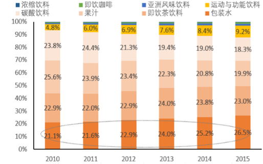 中國瓶裝水收入占比逐年增長