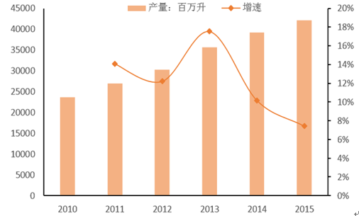 2010-2015我國瓶裝水行業(yè)產量與增速