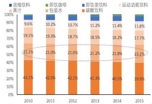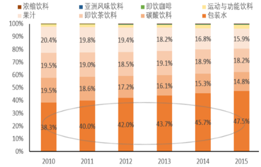 再以美國的軟飲料市場為例:近年來,受益于消費者認為瓶裝水比其他飲料類別 更健康這一觀點,美國市場對瓶裝水的需求保持強勁的增長。美國 Beverage Marketing Corporation(BMC)的數據顯示:美國人均瓶裝水消費量從 2005 年的 25.4 加侖增長到 2015 年的 36.5 加侖,增加了 11 加侖,增幅在 43.7%;但與此同時, 過去 10 年碳酸飲料的人均消費減少了 12.4 加侖。同時,Euromonitor 監(jiān)控數據也顯 示出美國軟飲料市場瓶裝水走強、碳酸飲料持續(xù)下滑的趨勢,瓶裝水在美國軟飲料行 業(yè)收入占比由 2010 年的 21.1%上升至 2015 年的 22.2%,而碳酸飲料的占比則從 2010 年的 43.1%下降至 39.9%。