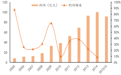 2005-2015.10我國瓶裝水利潤與增速