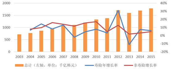 2009 年以來長期的低利率政策,使得韓國保費收入增幅僅維持在 5%左右。 2012 年,韓國保費出現(xiàn)短期小幅高增長, 這主要是得益于非連結(jié)型傳統(tǒng)保險產(chǎn)品的銷售穩(wěn)健及韓國 Nonghyup(農(nóng)業(yè)合作社)重組 NH Life 進入市場,但受到長期低利率、韓國經(jīng)濟低迷、韓國稅收優(yōu)惠政策三方面的限制,躉交 儲蓄產(chǎn)品的銷售受到了嚴重影響,韓國保費收入情況在 2013 年再次出現(xiàn)回落。