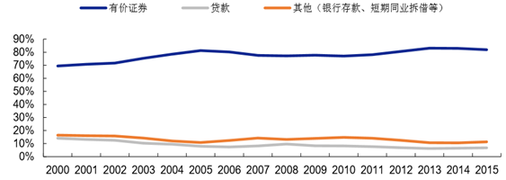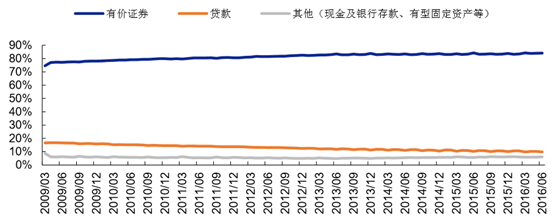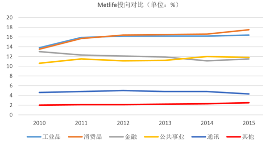 以美國規(guī)模最大的壽險公司 Metlife 為例,由于低利率環(huán)境下導(dǎo)致金融產(chǎn)品收益減少,市場預(yù)期相對悲觀,因此在公司的險資配置中,金融類投資占比不斷降低,從 2011 年 13%跌至 2015 年 11%左右。