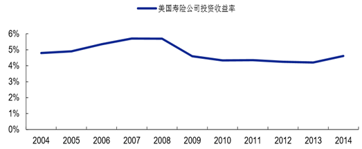 2008 年美國進入“零利率”之后,美國壽險公司投資收益率下滑幅度一度達到 1 個百分點,此后 2009-2014 年間,美國壽險公司投資 收益率維持在 4.2%以上,2014 年末,壽險公司投資收益率達到 4.6%,同比提升了約 0.4 個百分點。
