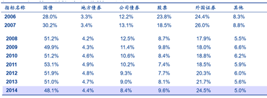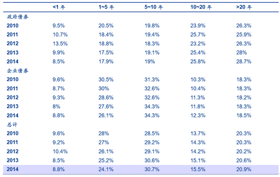2014 年,美國險資中,較為短期的投資金額為 884 億美元,僅占全部資產(chǎn)配置的 1.8%。與此相比,長期性投資占比則達到 48.5%。而在固收 類投資方面,美國壽險也偏好中長期政府債券與企業(yè)債券,且中、長期債券配置比例逐年增加。
