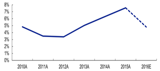 長期低利率水平使得美國保費投資回報吸引力下降,特別是對于受市場利率影響較大的萬能 險而言,投資收益影響較大,保單銷售乏力,因而導(dǎo)致美國保費收入增速放緩,壽險保費收 入增速放緩明顯。就中國而言,2016 年上半年,保費持續(xù)高增長,但受到低利率影響,上 半年債券收益率由年初的 2.87%下降至上半年末的 2.84%,使得上市險企投資收益率在上半 年出現(xiàn)明顯的下降(中國平安 4.4%、中國人壽 4.36%、中國太保 4.7%、新華保險 5.3%), 投資收益率的下滑對 2016 年下半年保費增速將產(chǎn)生負面影響。