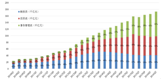 2016年二季度末,68家信托公司的信托資產規模為17.29萬億元,較同 期增加 1.42 萬億元,同比增幅 8.95%,環比增幅僅為 4.25%。整體看, 增長放緩,增量效益貢獻下滑。2015 年三季度末甚至出現 2010 年以來 的首次季度下降。規模放緩原因在于宏觀經濟下行和經濟結構調整背景下,新 增信托規模增長乏力,同時存續信托資產進入兌付高峰。且 15 年三季 度,國家對場外配資尤其是對傘形信托的清理,以及證監會要求將信 托接口轉接到券商,導致不少投資股票的信托產品被迫清盤,這也是原因之一。