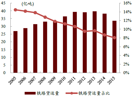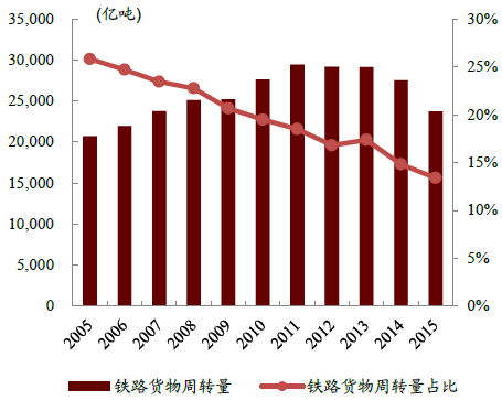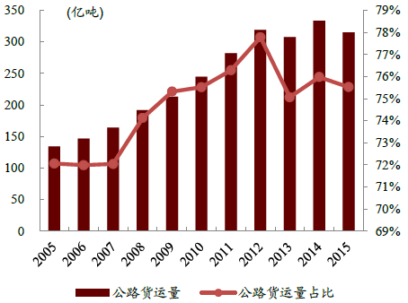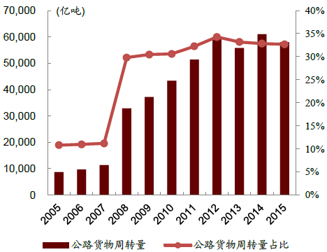 中國經濟結構的轉型已經在過去三年有所反應,鐵路總的貨運量自13 年起開始下降,預計和大宗商品的需求不振有關;而公路貨運量13 年絕對值和占比基本上維持在穩中有降的格局。從貨物周轉量的數據來看,公路貨物周轉量好于鐵路貨物周轉量,并且已維持住30%以上穩定占比,而鐵路貨物周轉量同貨運量走勢相同,均從13 年起進入雙降。