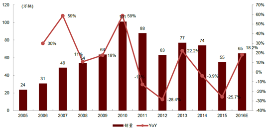 重卡銷量自2010 年超過100 萬輛之后,2011/12 年明顯見頂回落,2013 年短暫復蘇之后又開始兩年的下滑,我們預計2016 年銷量為65 萬輛左右,同比增長18.2%。
