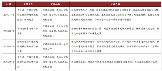 8 月18 日,交通運輸部、工業和信息化部、公安部、工商總局、質檢總局五部門聯合發布了《關于進一步做好貨車非法改裝和超限超載治理工作的意見》、《車輛運輸車治理工作方案》及一系列后續政策,旨在加強對貨車超限超載與非法改裝的整治,推進汽車整車物流行業健康發展。