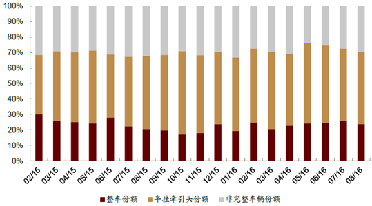 從月度市場份額變動來看,整車與半掛牽引車份額占比已保持在70%以上,其中半掛牽引車占比由15 年1 月的37%提升至16 年8 月的47%,銷量貢獻保持第一,重卡整車的市場份額也相對穩步提升。
