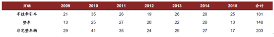 考慮到目前治理超載剛剛執行,終端的重卡用戶存在部分觀望情緒,重卡是典型的生產資料,預計明年3 月旺季有望迎來更新高峰期,更新的需求有望延續到明年年中甚至年底,如果這部分更換節制按照2016/17/18 年更換為5/10/5 萬輛的節奏進行,預計明年