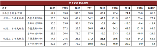 即使是按照新增量的更換需求來看,2009~2011 年前后購臵的車輛在未來1-2 年內面臨著更新,這三年重卡的銷量總和在253 萬輛左右,理論上來看重卡整體面臨著較大的更