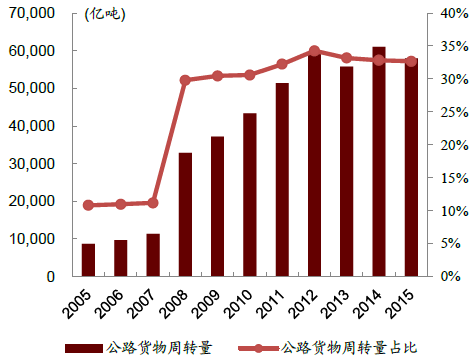 2005-2015年公路貨物周轉(zhuǎn)量及占比