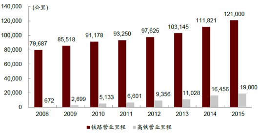 2008-2015年鐵路與高鐵運(yùn)營里程數(shù)