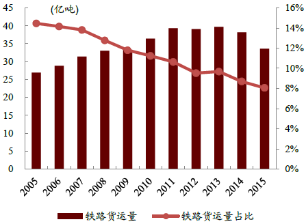 2005-2015年中國鐵路貨運(yùn)量及占比