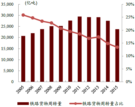 2005-2015年鐵路貨物周轉(zhuǎn)量及占比