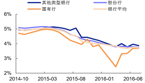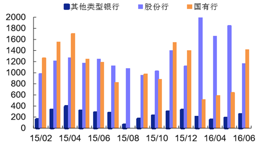 從理財(cái)產(chǎn)品發(fā)行情況來看,股份行發(fā)行理財(cái)產(chǎn)品數(shù)量逐漸趕 超國(guó)有五大行。截至 2015 年底,股份制銀行理財(cái)資金規(guī)模為 9.91 萬億元,市場(chǎng)占比 42.17%, 同比增速超過 70%。從理財(cái)收益率來看,國(guó)有銀行收益率在今年年初出現(xiàn)較大滑坡,中小銀行理 財(cái)收益率隨受市場(chǎng)影響整體下行,但下行趨勢(shì)較為平緩。中小銀行往往在理財(cái)投資和客戶服務(wù)方 面較五大行更為盡心,年輕的個(gè)人投資者更多地接受和信任中小銀行的理財(cái)服務(wù),五大行的渠道 優(yōu)勢(shì)和規(guī)模優(yōu)勢(shì)被逐漸蠶食。