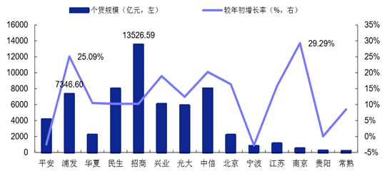 根據(jù)已披露的公司中報(bào),除了平安銀行和寧波銀行今年上半年個(gè)人 貸款規(guī)模較年初出現(xiàn)負(fù)增長(zhǎng)、貴陽銀行基本與年初持平之外,其余上市中小銀行的個(gè)人貸款均保 持較高的增速。其中,上半年增速最快的是南京銀行,這與其開始重視零售業(yè)務(wù)和偏低的基數(shù)有 關(guān);其次是目標(biāo)“做大零售和小微”的浦發(fā)銀行,在超 7000 億的個(gè)貸規(guī)模下仍較年初有 25.09% 的增長(zhǎng),體現(xiàn)了較強(qiáng)的增長(zhǎng)潛力。上半年規(guī)模最大的仍是素有“零售之王”招商銀行,個(gè)人貸款 規(guī)模突破 1.35 萬億元,超過排名第二的中信銀行 0.55 萬億元。