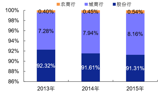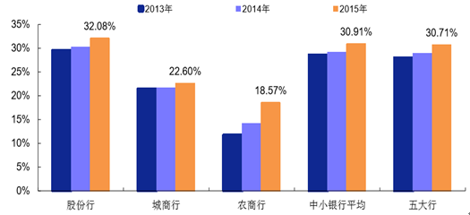 2013-2015 年各類上市銀行個(gè)人貸款占總貸款比重