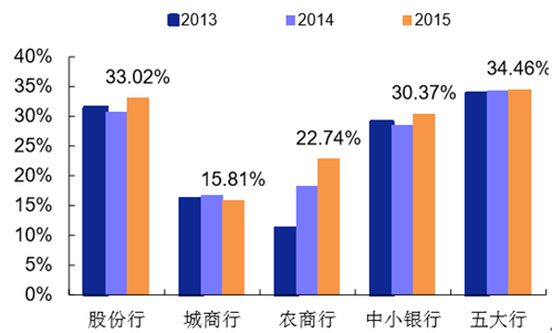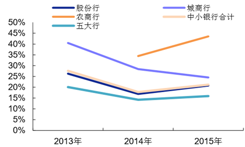 2013-2015 年各類上市銀行個(gè)貸占中小銀行比重