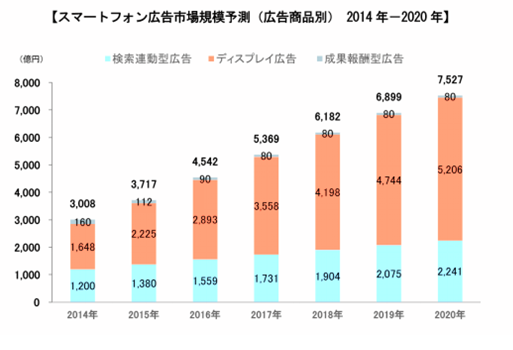 2015年日本智能手機廣告市場中,關鍵字搜索廣告市場規模為1380億日元(年增長率15%),展示廣告市場規模為2225億日元(年增長率35%),成果報酬型廣告市場規模為112億日元,較前年減少30%。