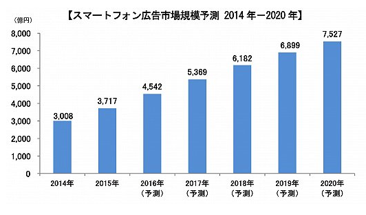 2015年日本智能手機廣告市場規模達到3717億日元,年增長率23.6%。