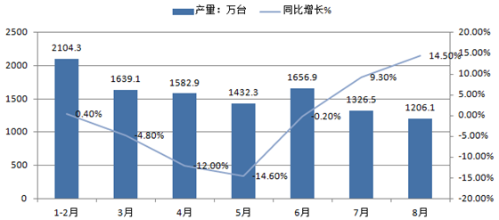 8月份,國內房間空氣調節器生產1206.1萬臺,同比增長14.5%。