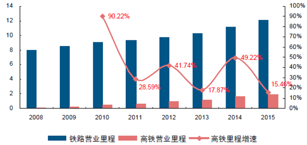 核心提示:從2008 年京津城際通車運營開始,高鐵在過去八年里快速發展,并在國民經濟和日常生活中扮演著日益重要的角色。到2015 年底,全國鐵路營業里程達到12.1 萬公里,居世界第二位;其中高鐵運營里程超過1.9 萬公里,居世界第一位,占世界高鐵總從2008 年京津城際通車運營開始,高鐵在過去八年里快速發展,并在國民經濟和日常生活中扮演著日益重要的角色。到2015 年底,全國鐵路營業里程達到12.1 萬公里,居世界第二位;其中高鐵運營里程超過1.9 萬公里,居世界第一位,占世界高鐵總里程的60%以上;高鐵在鐵路運營里程中的占比逐年提升,已達15.70%。