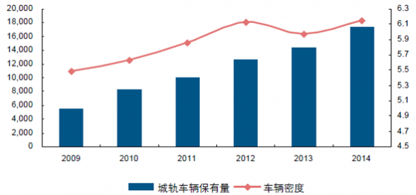 2010 年之后,城市軌道交通車輛密度整體逐步提升