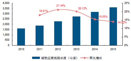 據交通部數據,2015 年地鐵和輕軌運營長度同比增長12.58%