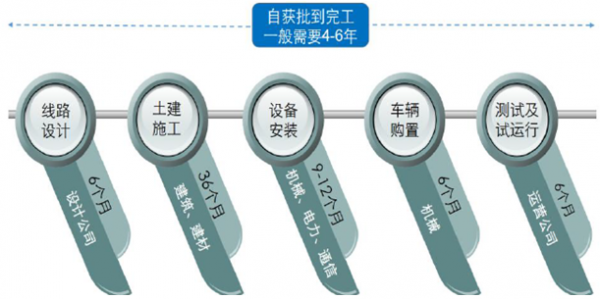 就軌道交通項目整體而言,其成本結構一般較為穩定:土建工程(含車輛段)占55%, 機電設備(含信號系統)占20%,車輛及零部件占10%,其他費用占15%。不同軌交制式的成本占比差異不大,但從每公里造價來看,高鐵和城際約為1.5-2.5 億元,城軌(地鐵和輕軌)約為6-8 億元。時間跨度上來說,完整軌道交通工程自獲批到完工一般需要4-6 年時間,依次經過線路設計、土建施工、設備安裝、車輛購置、測試及試運行等5 大階段。