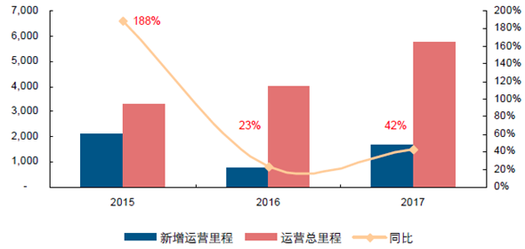 從我們統計的目前在建和已批復的線路情況來看,地鐵和輕軌的新增運營里程在2016 年及2017 年將大幅提升,運營總里程相繼突破4000 公里和5000 公里,復合增速達30%。